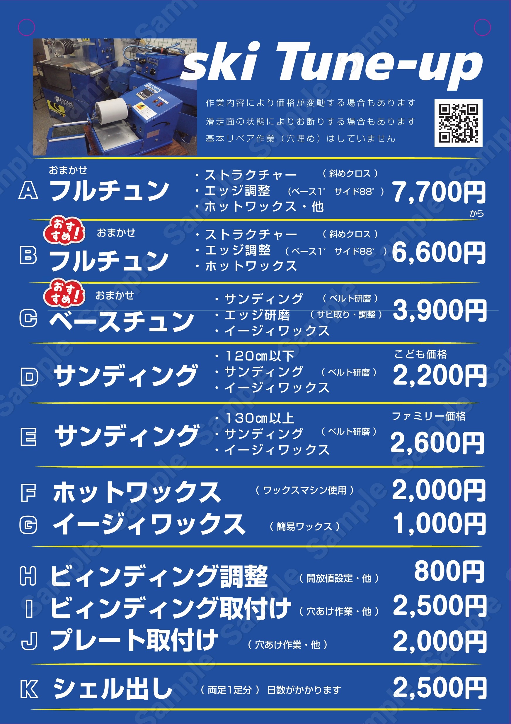 メンテナンスには、滑走面とエッジの研磨、ワックスがけ、ビンディングの調整などが含まれます。